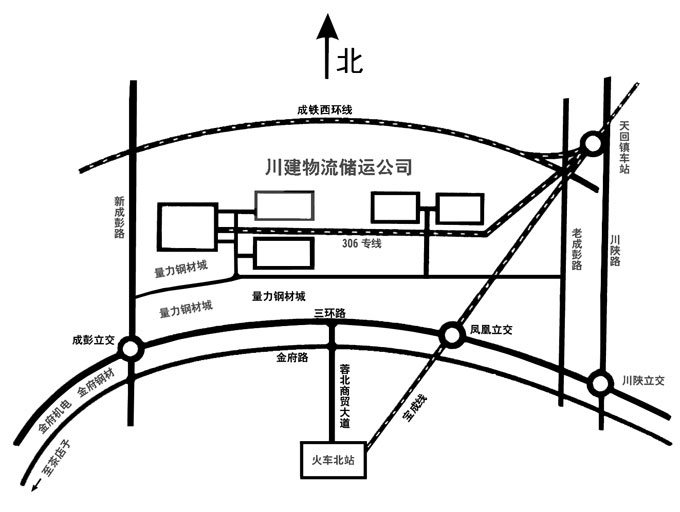 川建物流公司地理位置得天獨(dú)厚,地處成都市外北洞子口生資、建材、機(jī)電市場(chǎng)黃金地段,三環(huán)路成彭立交橋外200米,西緊靠新成彭公路;東臨國(guó)家鐵路寶成線、南通過(guò)成都市蓉北商貿(mào)大道僅4公里到達(dá)成都火車北站;北有成都鐵路西環(huán)線、成都繞城公路環(huán)繞其外;公司擁有5.8公里306鐵路專線與寶成鐵路在天回鎮(zhèn)接軌,自有GK1C、東方紅5型內(nèi)燃機(jī)車各一臺(tái),并有編組站線。四通八達(dá)方便快捷,是貨物儲(chǔ)存中轉(zhuǎn)的理想場(chǎng)地。川建物流儲(chǔ)運(yùn)公司機(jī)械化操作程度高,各類裝卸設(shè)備齊全,有8噸、16噸、50噸汽車吊各一臺(tái);有C7022、C5530、H3/36B等塔式起重機(jī)5臺(tái);10噸、20噸行車3臺(tái);3噸叉車2臺(tái)。本公司還有專業(yè)運(yùn)輸車隊(duì),各型載重汽車數(shù)十輛,并具有維修各種工程機(jī)械、汽柴油機(jī)動(dòng)車輛的能力和資格。